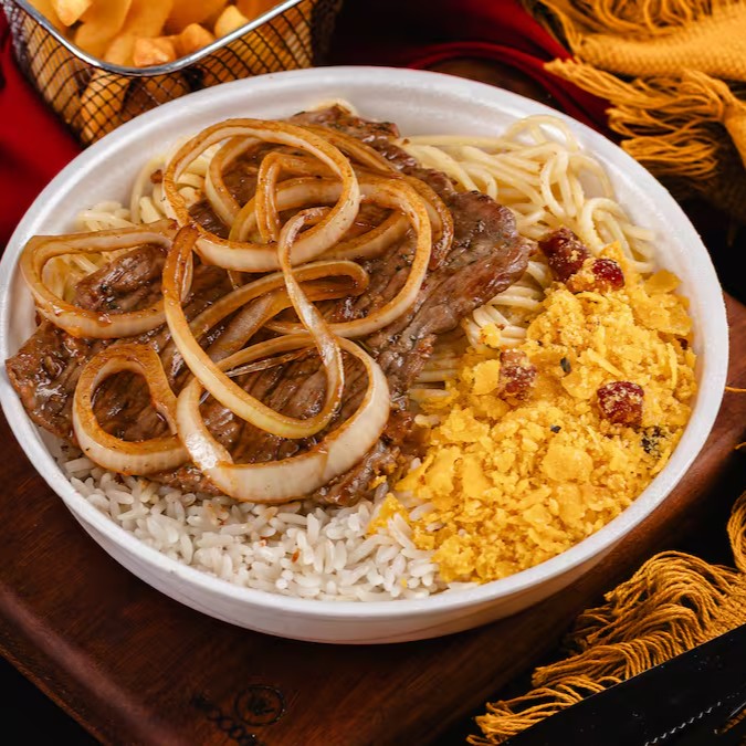Arroz soltinho, feijão bem temperado, macarrão alho e óleo, farofa da casa, fritas e Bife Acebolado.