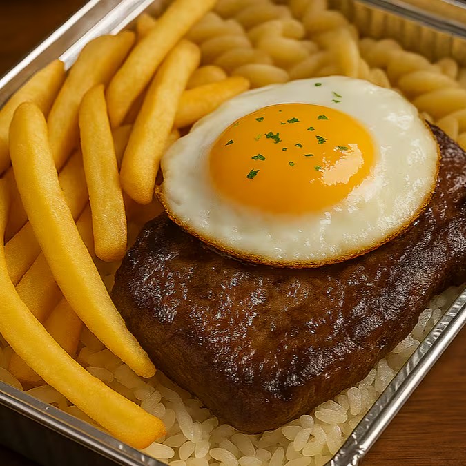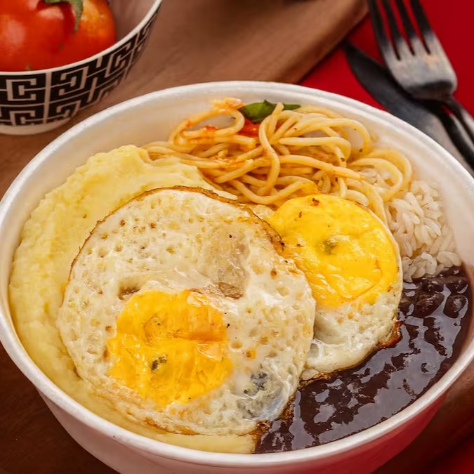 Arroz soltinho, feijão bem temperado, macarrão alho e óleo, fritas e 2 Ovos Fritos.