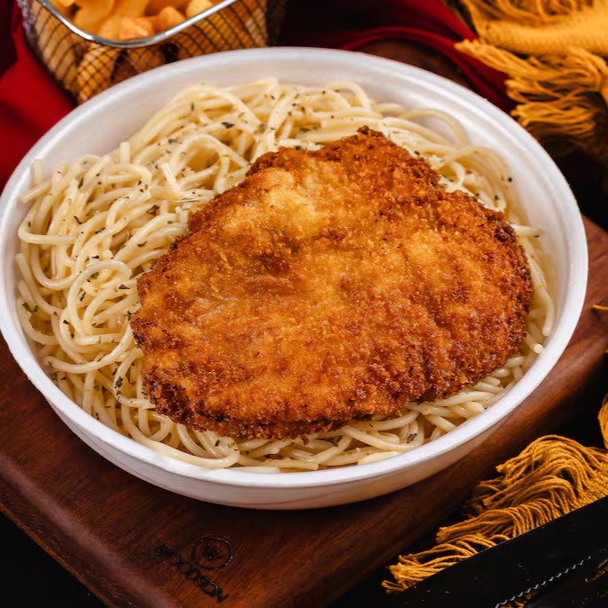 Macarrão al dente (alho e óleo) acompanhado de Frango à Milanesa Douradinho!