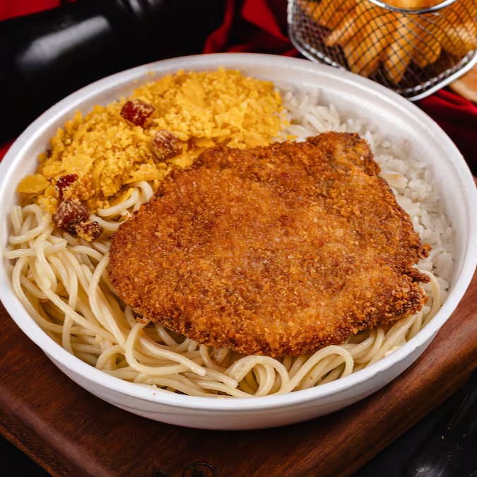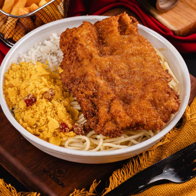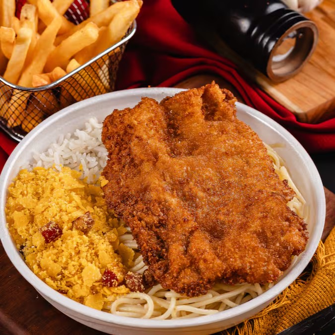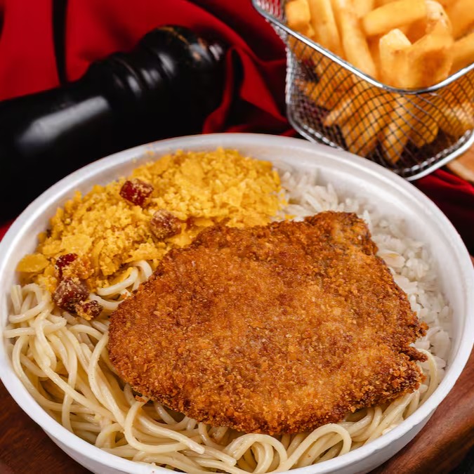 Arroz soltinho, feijão bem temperado, macarrão alho e óleo, farofa da casa, fritas e um Bife à Milanesa douradinho.