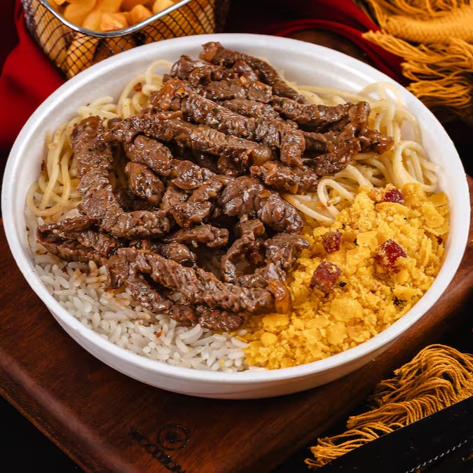 Arroz soltinho, feijão bem temperado, macarrão alho e óleo, farofa da casa, purê cremoso e Tiras de Carne suculentas.