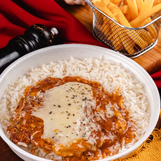 Arroz soltinho, fritas e filé de frango à parmegiana.