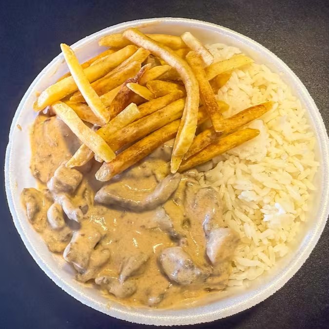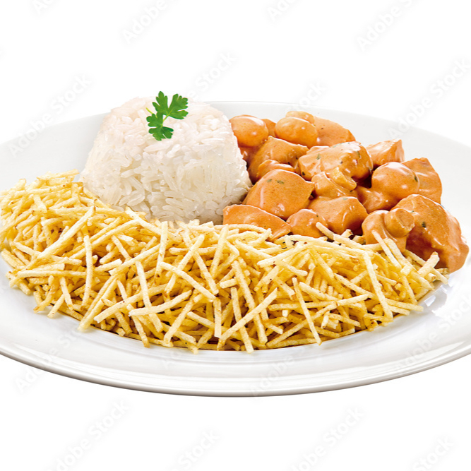 Acompanhamentos: Strogonoff de carne, batata frita e arroz