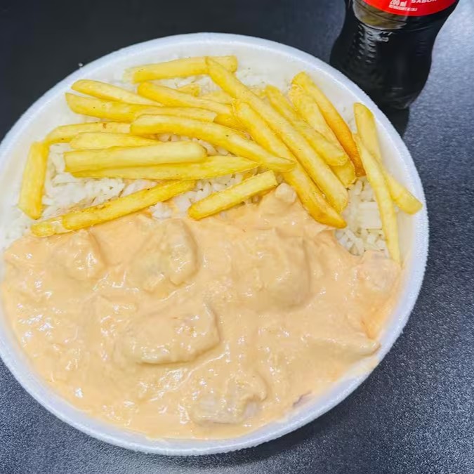 Marmita de Strogonoff de Frango + Batata Frita + Arroz