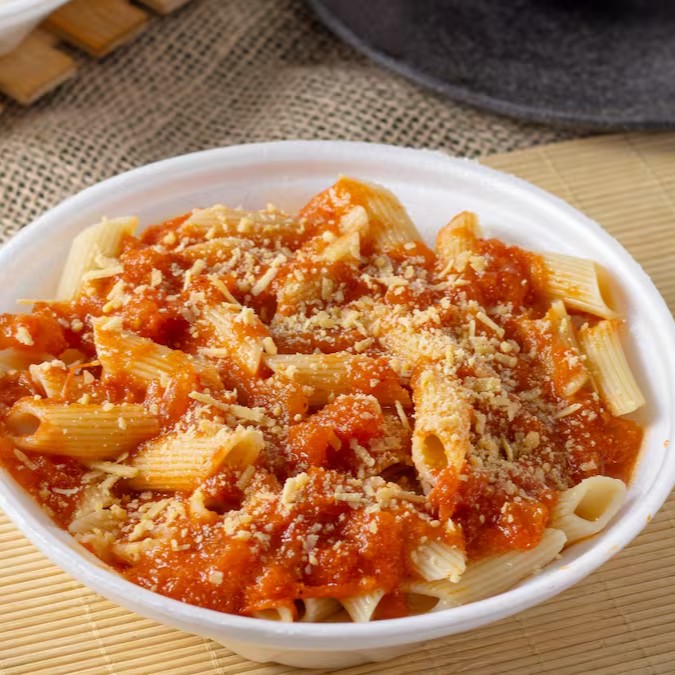 Macarrão ao molho pomodoro com parmesão ralado acompanhado de isca de frango