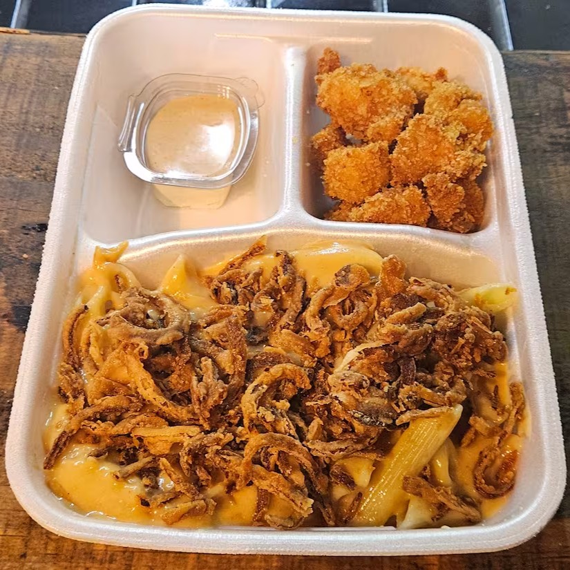 Macarrão com molho francês e cebola crispy acompanhado de isca de frango