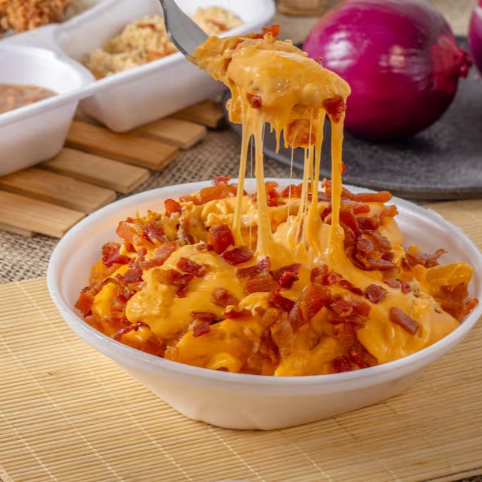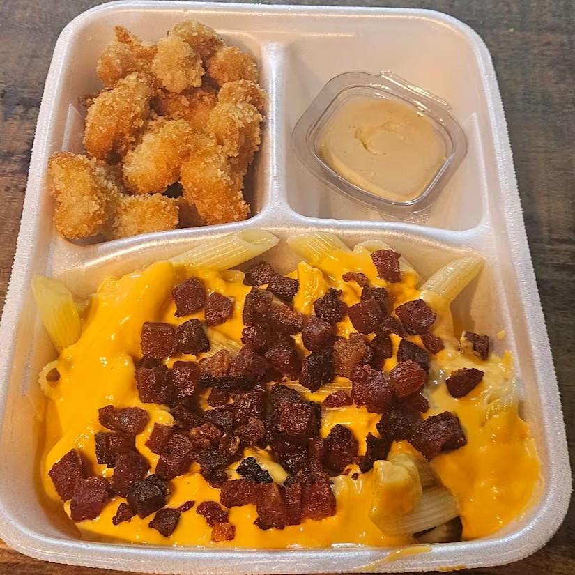 Macarrão com cheddar cremoso e bacon acompanhado de iscas de frango