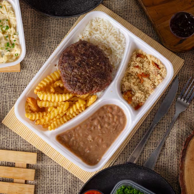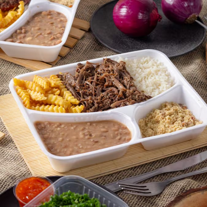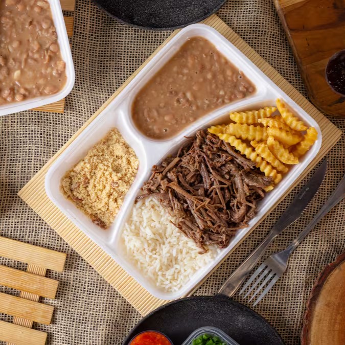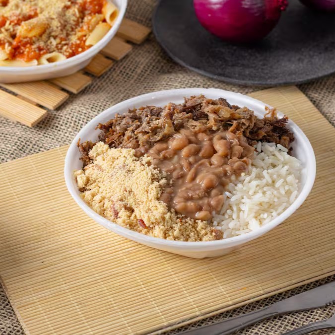Arroz soltinho, feijão bem temperado, batata frita, 200g de costela bovina desfiada e farofa com bacon da casa