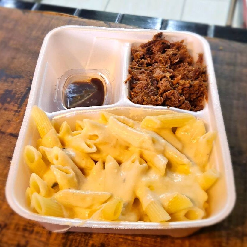 Macarrão com cheddar cremoso e bacon acompanhada de costela desfiada