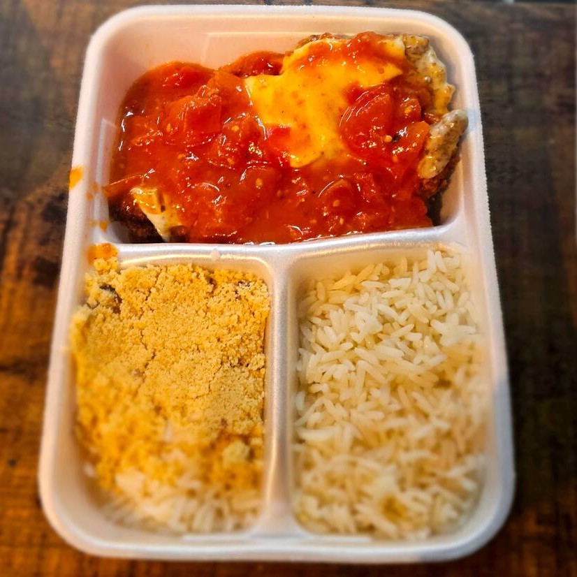Arroz, farofa e parmegiana de coxa sobre coxa finalizada com Catupiry Original e queijo ao molho pomoro caseiro