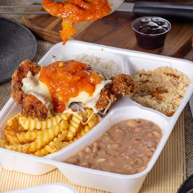 Desfrute de um delicioso 'Frango à Parmegiana', um clássico favorito da categoria 'Comidas do Dia a Dia'. Este prato de 750g é composto por um arroz incrivelmente soltinho e um feijão caseiro de dar água na boca. Acompanha uma generosa porção de batatas fritas crinkle, crocantes e douradas, além de uma farofa saborosa. O destaque é o frango empanado, com uma crocância irresistível, generosamente coberto com queijo à parmegiana derretido. Uma refeição completa e prazerosa para o seu Dia a Dia.