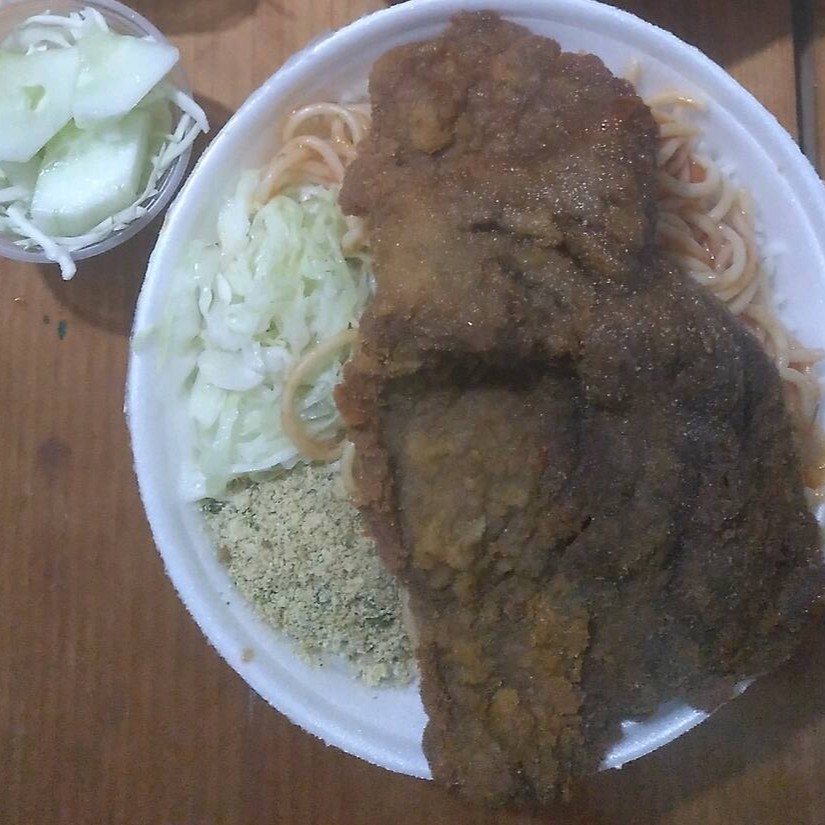 Arroz feijão macarrão farofa e Peito de frango com batata palito frito.