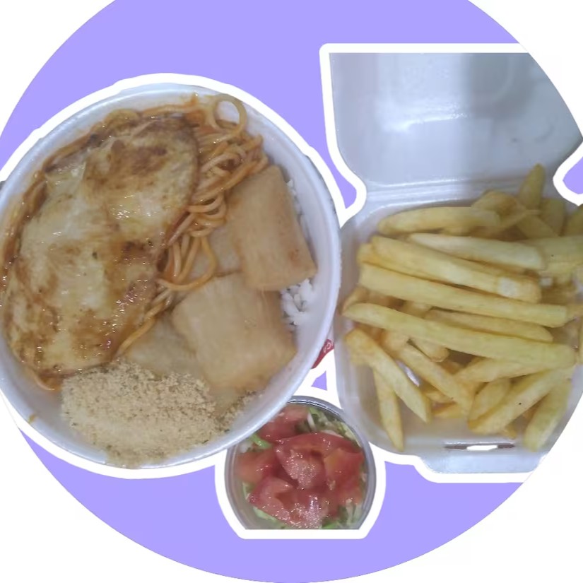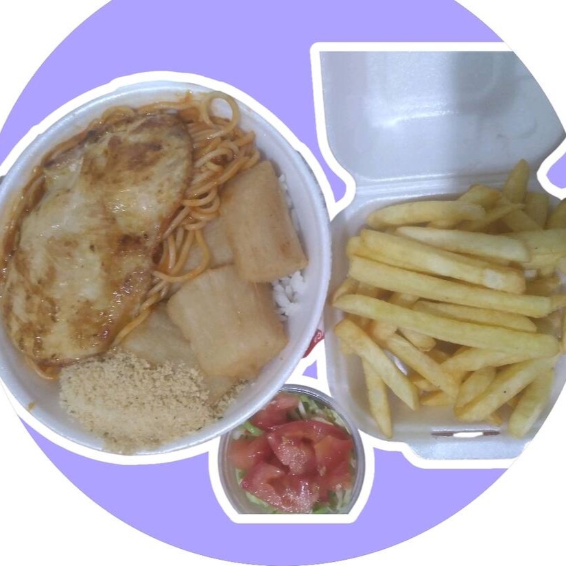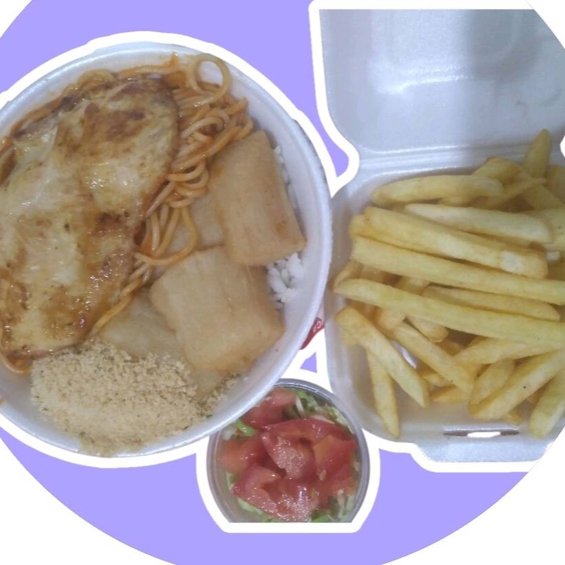 Arroz feijão macarrão farofa e Peito de frango com batata palito frita.