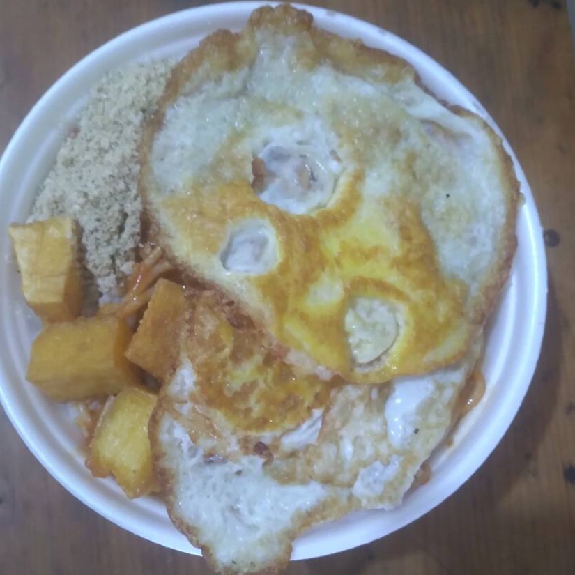Arroz feijao macarrao farofa salada e ovos fritos