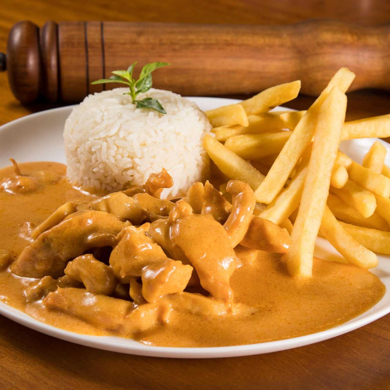 Strogonoff de frango, arroz e fritas. ***Bebida conforme a disponibilidade***