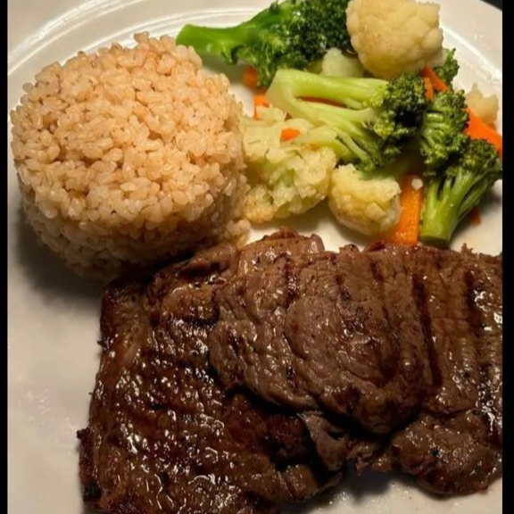 Arroz integral ou Batata doce, Seleta de legumes, 2x Bifes de alcatra grelhado