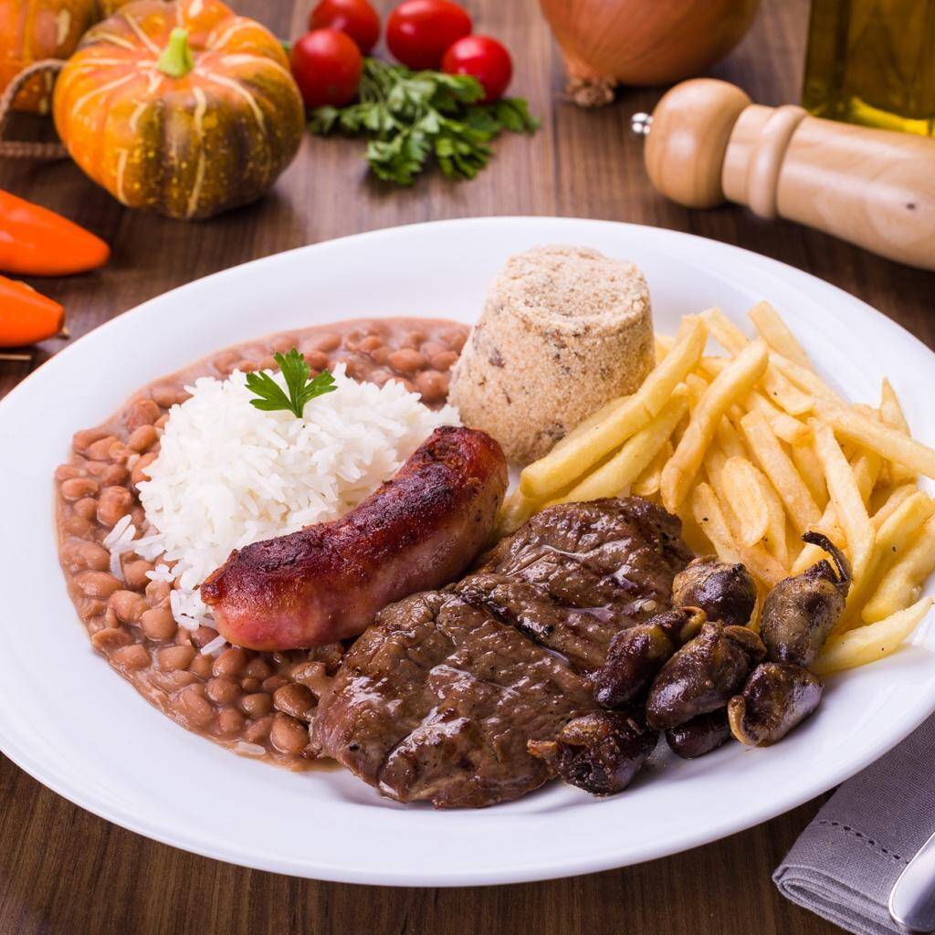 Arroz, Feijão, Farofa, Batata frita, 1 bife de alcatra, Coração, 1 Linguiça
