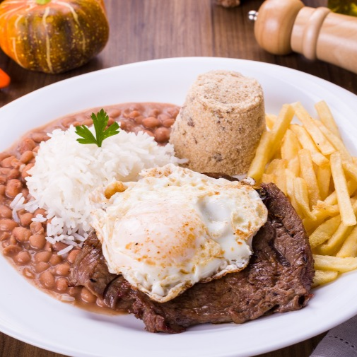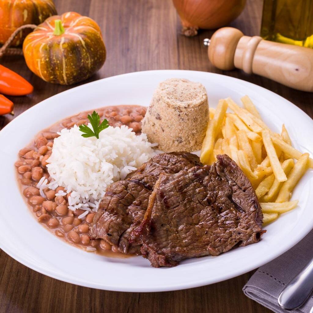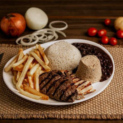 Arroz, Feijão, Farofa, Batata frita, 2 bife de alcatra, 1 ovo