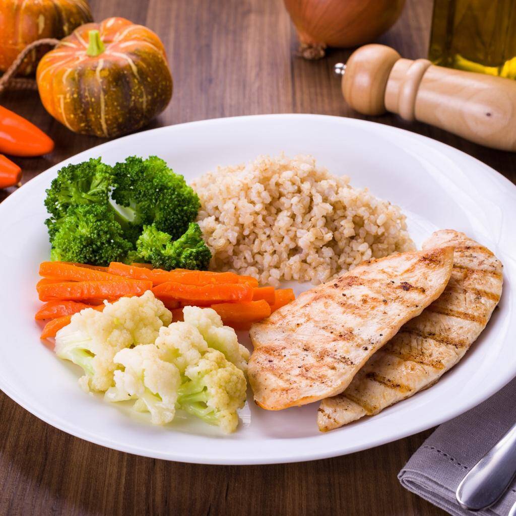 Arroz integral ou Batata doce, Seleta de legumes, 2x Peito de frango grelhado