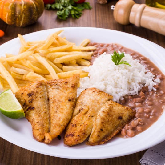 Arroz, Feijão, Batata frita, Tilapia grelhada