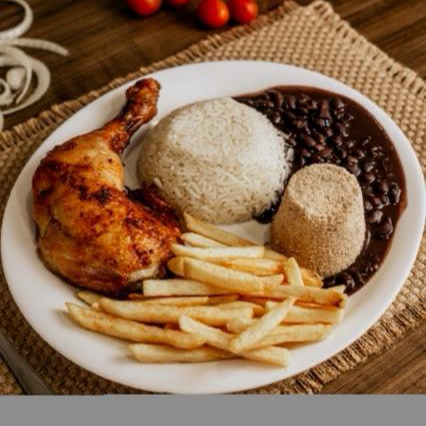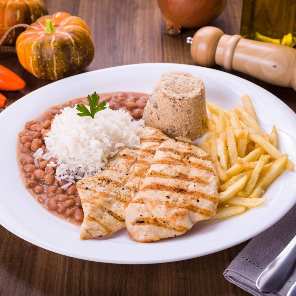 Peito de frango grelhado, arroz, feijão, farofa e fritas ***Bebida Conforme Disponibilidade ***