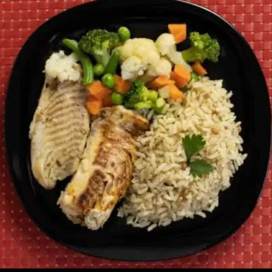 Arroz integral ou Batata doce, Seleta de legumes, Tilápia grelhada