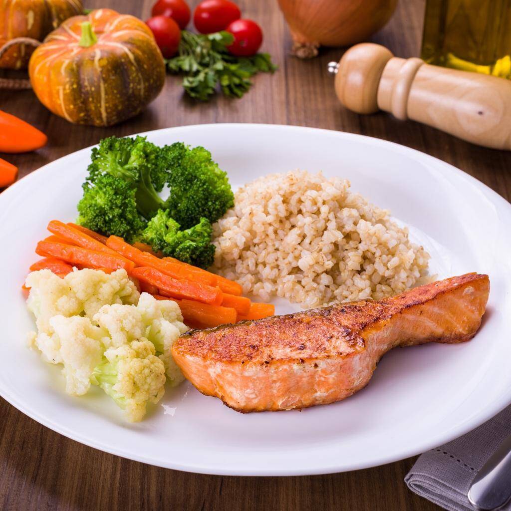 Arroz integral ou Batata doce, Seleta de legumes, 2x Filé de Salmão grelhado