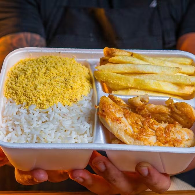 Acompanha arroz soltinho, batata frita crocante e uma salada fresca de alface e tomate.