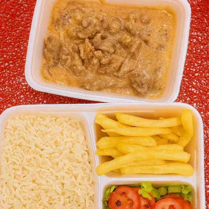 Novidade! Nosso Delicioso Strogonoff de Frango Acompanha 250g de Arroz, 250g de Strogonoff de Frango e Batata Frita