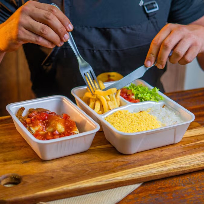 Nossos Pratos Executivos São Enviados em Embalagens com Repartições, Garantindo Praticidade e Organização. Recebeu, Tirou a Tampa e Já Pode Comer!