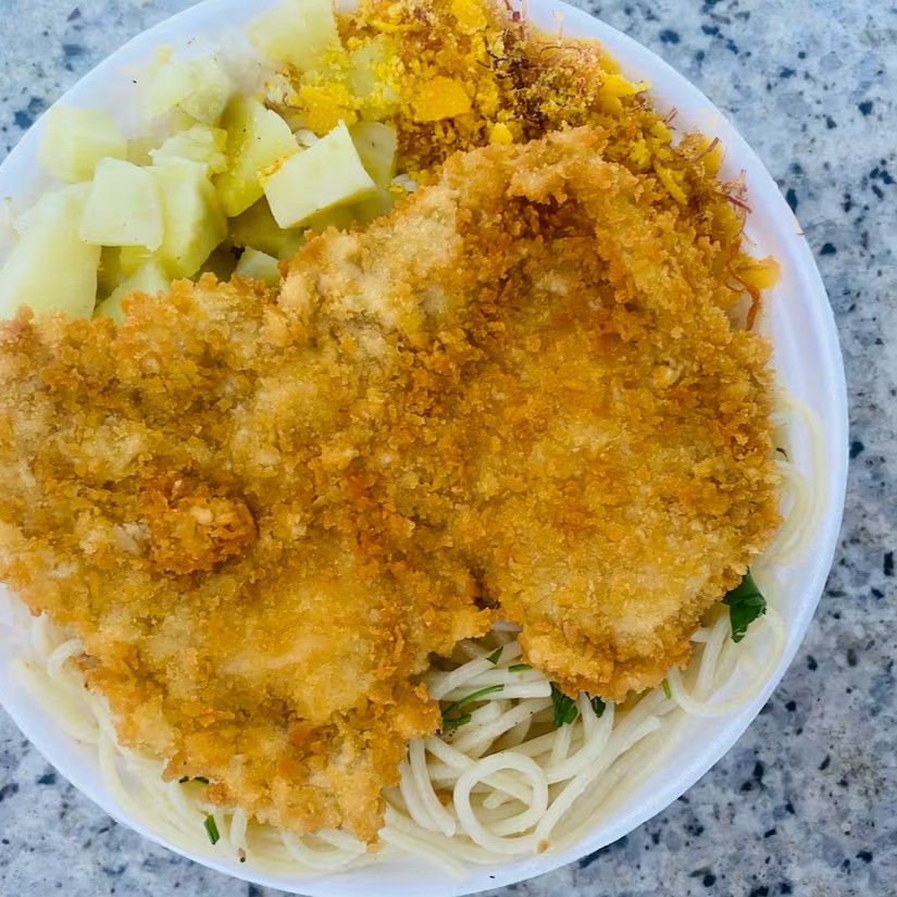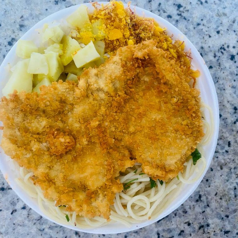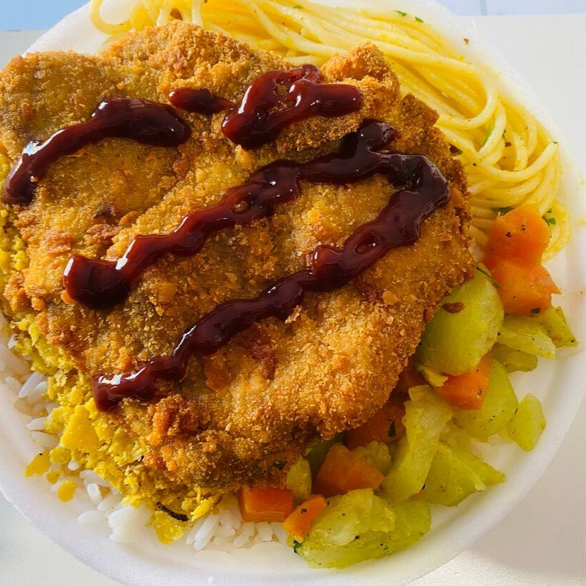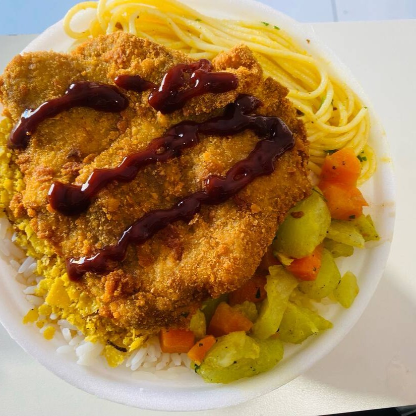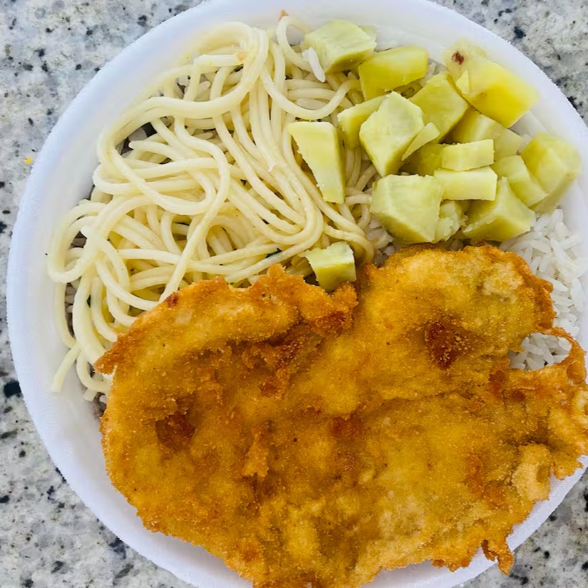 Arroz,Feijão,Macarrão (alho e óleo),Farofa Caseira e Refogado do Dia. *Nessa marmita vai 1 filé de frango a Milanesa *