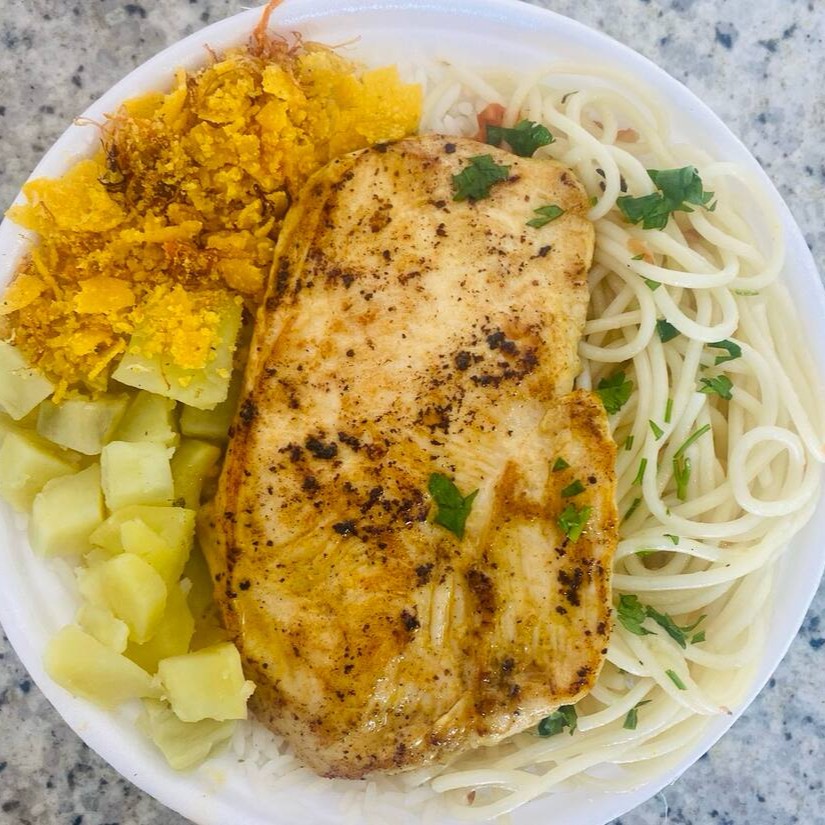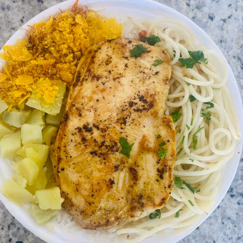 Arroz,Feijão,Macarrão (alho e óleo),Farofa Caseira e Refogado do Dia. Nessa marmita vai 2 filé de Frango grelhado