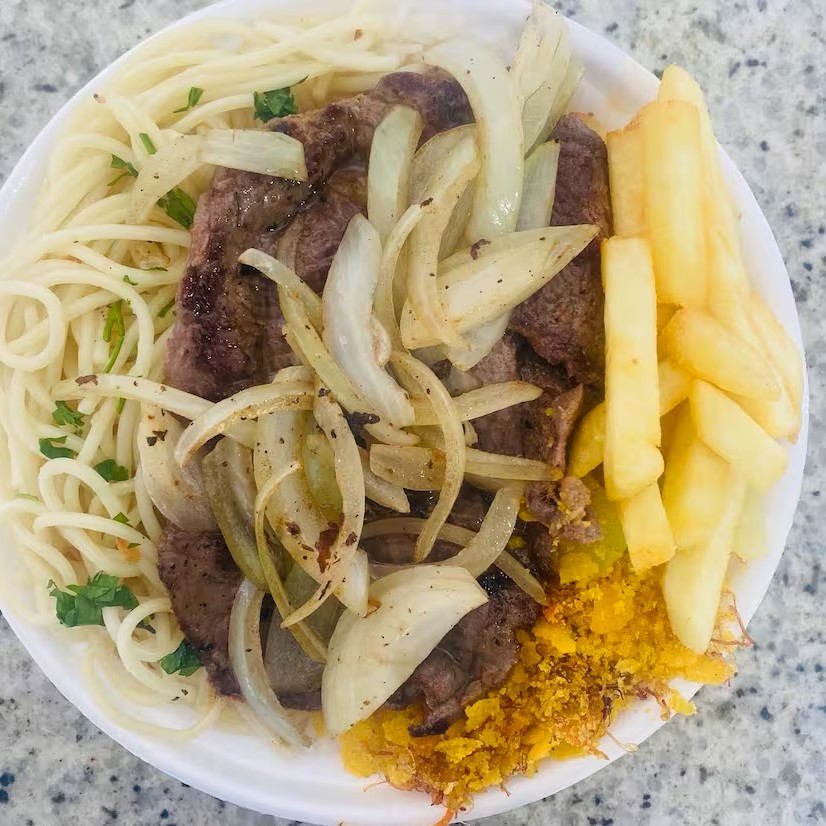 Arroz,Feijão,Macarrão( alho e óleo,),Farofa Caseira e Refogado do dia. Nessa marmita vai 2 Bife acebolado