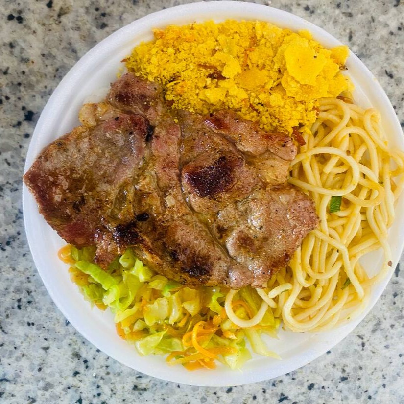 Arroz, Feijão, Macarrão,Farofa caseira, Refogado do Dia e Pernil de Porco Grelhado.