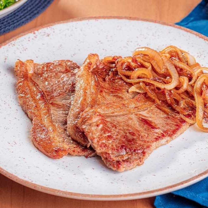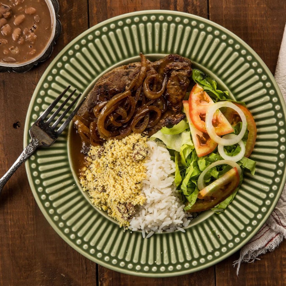 Acompanha: Bife Acebolado, Arroz, Feijão preto, Macarrão, legumes refogado e saladas