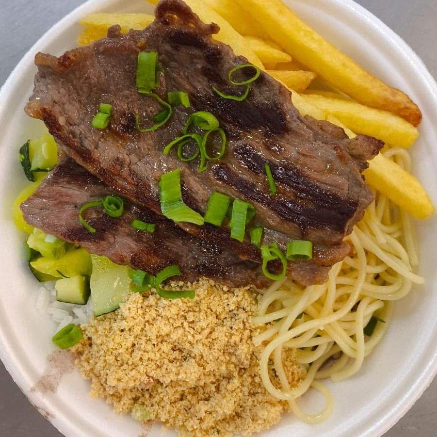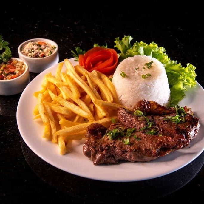 Acompanha: Bife Acebolado, Arroz, Feijão preto, Macarrão, legumes refogado, fritas e saladas
