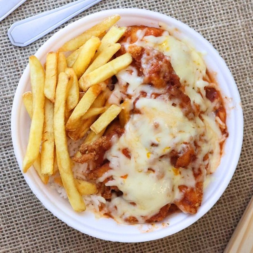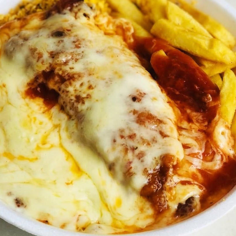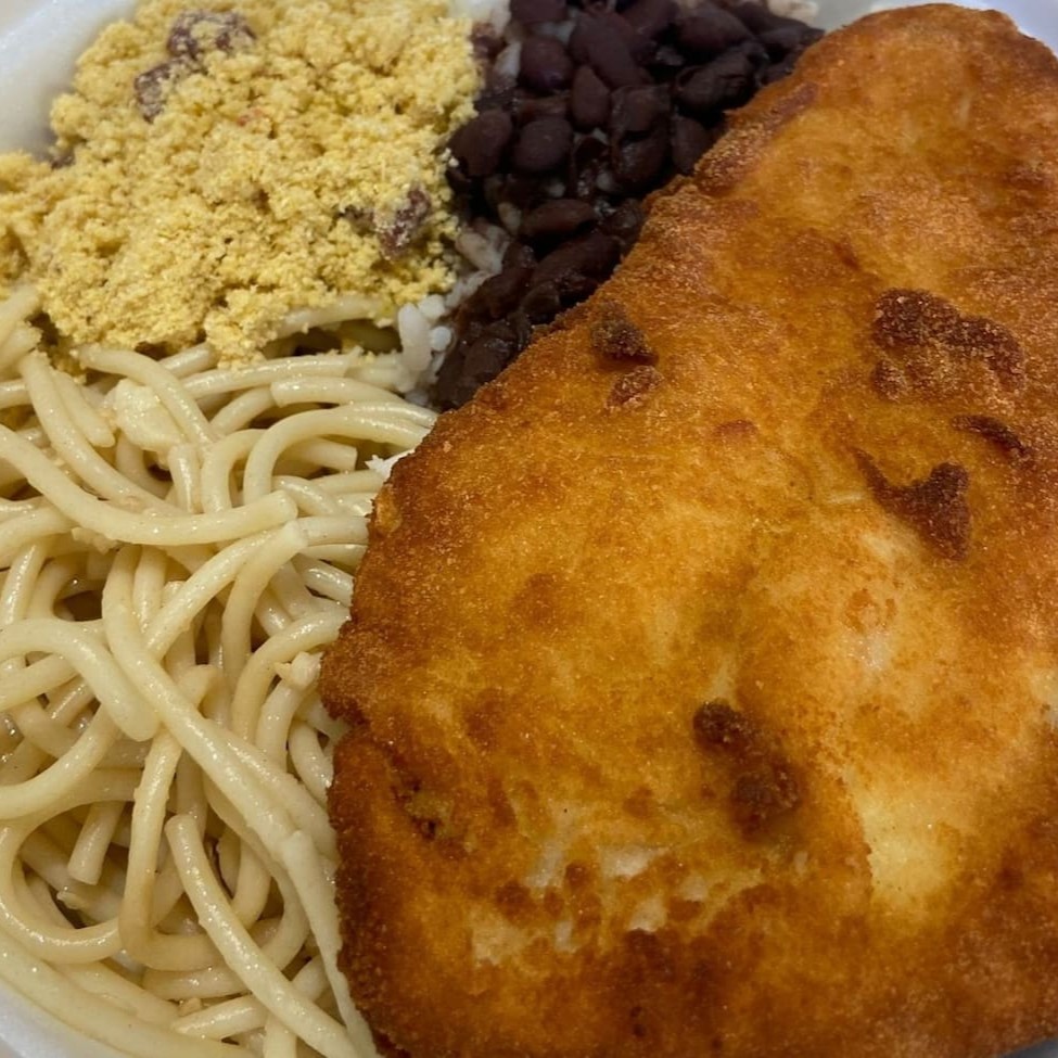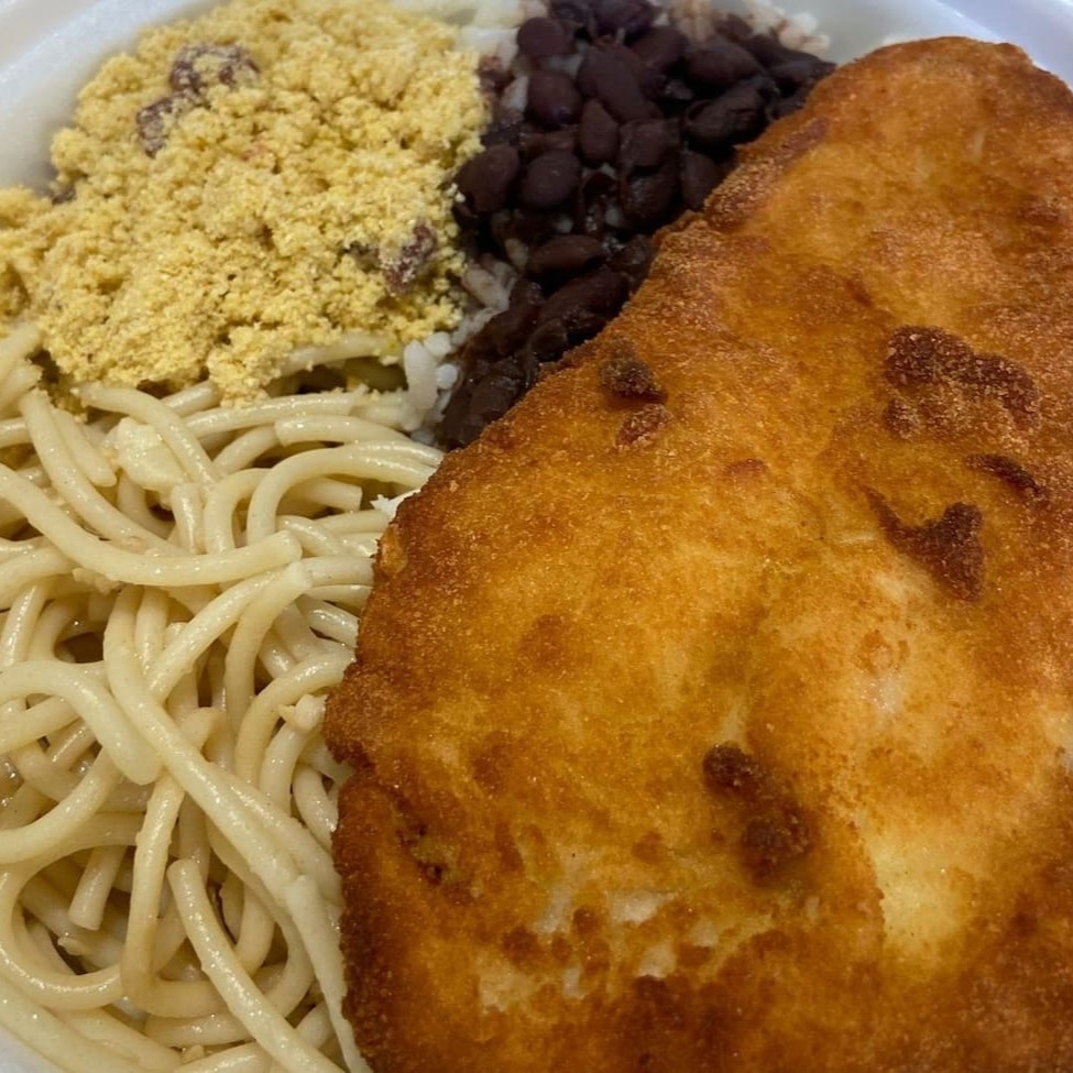 Frango à Parmegiana empanado e coberto com queijo derretido e molho de tomate caseiro. Acompanha arroz soltinho, feijão temperado, farofa crocante e batata frita dourada.