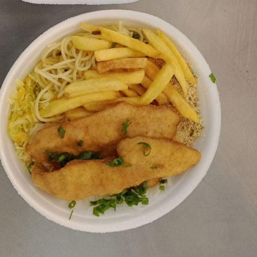 Acompanha: Arroz, Feijão preto, Macarrão, legumes refogado, fritas e salada