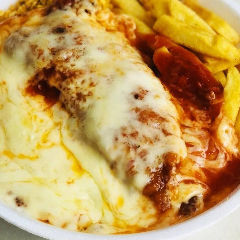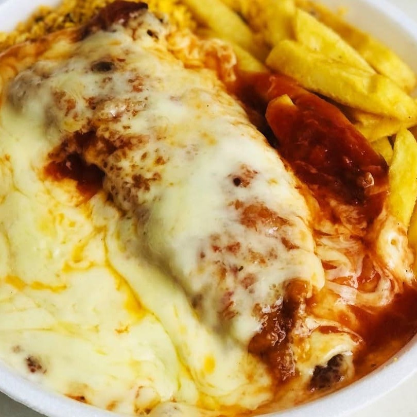 Bife empanado crocante, coberto com queijo derretido e molho de tomate caseiro. Acompanha arroz soltinho, feijão temperado, farofa dourada e batata frita crocante.