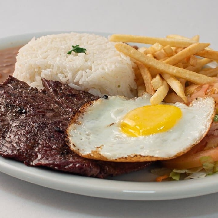 Acompanha: Bife coberto com Ovo, Arroz, Feijão preto, Macarrão, legumes refogado, fritas e saladas