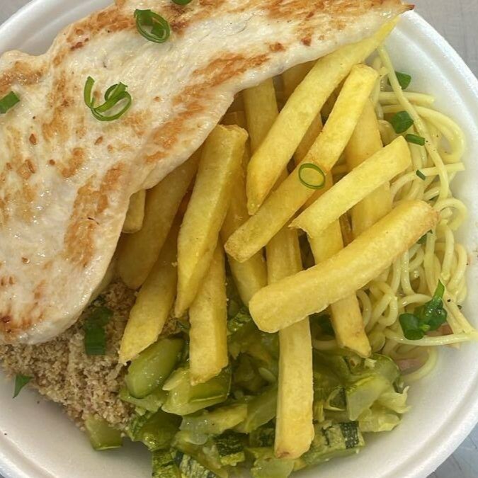 Uma refeição completa com arroz soltinho, feijão preto temperado, macarrão, legumes refogados, batata frita crocante e salada fresca. Acompanha Coca Cola 200ml geladinha! ️