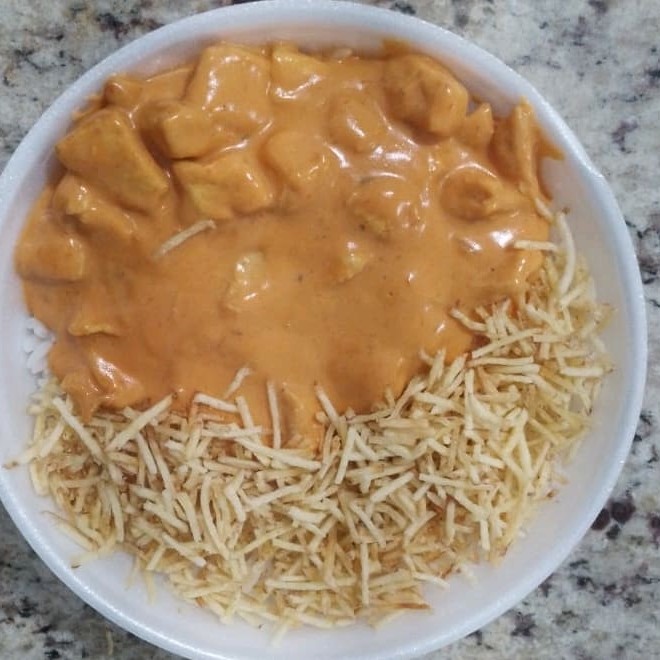 Marmita Media: Strogonoff de frango com arroz e batata palha. Uma deliciosa pedida para seu almoço ou jantar! Obs: não acompanha feijão