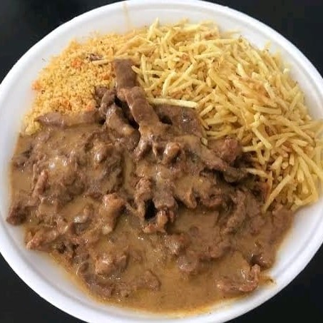 Marmita Media: Strogonoff de carne com arroz e batata palha. Uma deliciosa pedida para seu almoço ou jantar! Obs: Não acompanha feijão!