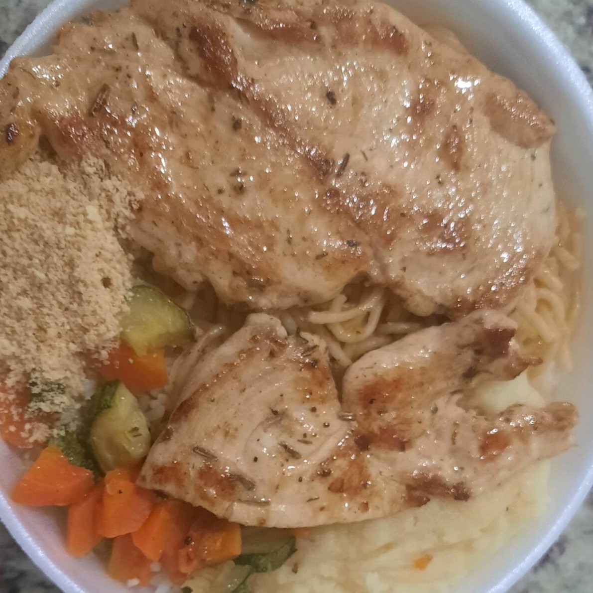 Marmita Pequena: Frango grelhado,arroz, feijão, macarrão e farofa.