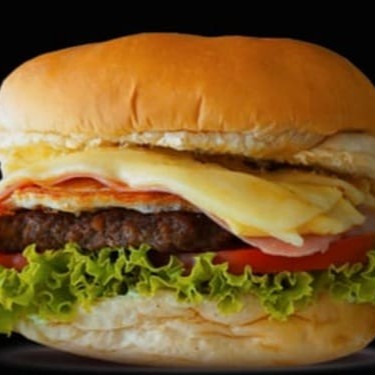 Pao, hamburguer, ovo, queijo mussarela, presunto, alface e tomate
