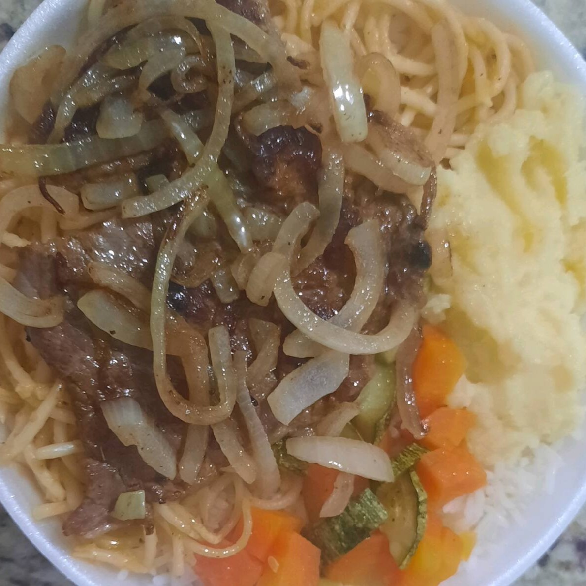 Tamanho Média:Delicioso bife acebolado,acompanhado de arroz, feijão, macarrão e farofa. Refeição completa para seu almoço ou jantar!