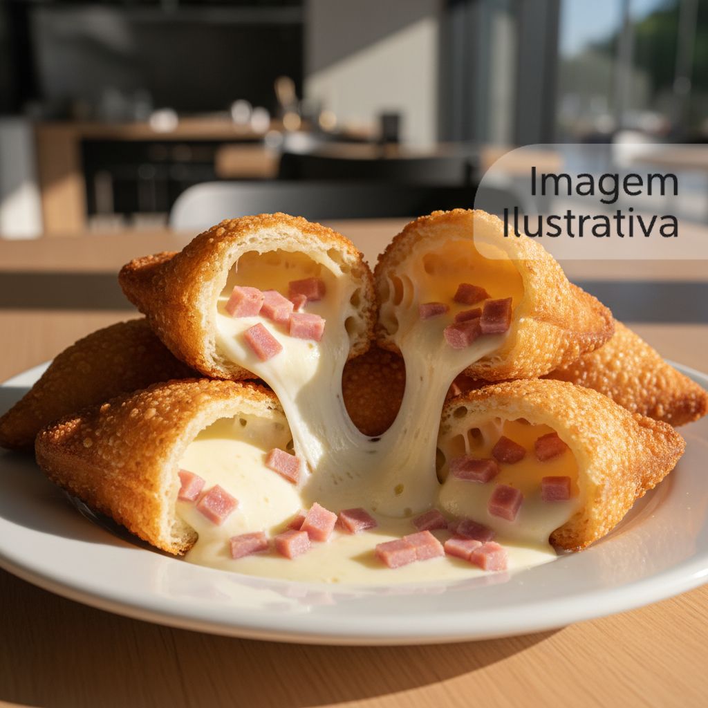 Recheio de queijo, presunto e orégano em um pastel crocante. Um clássico reinventado.