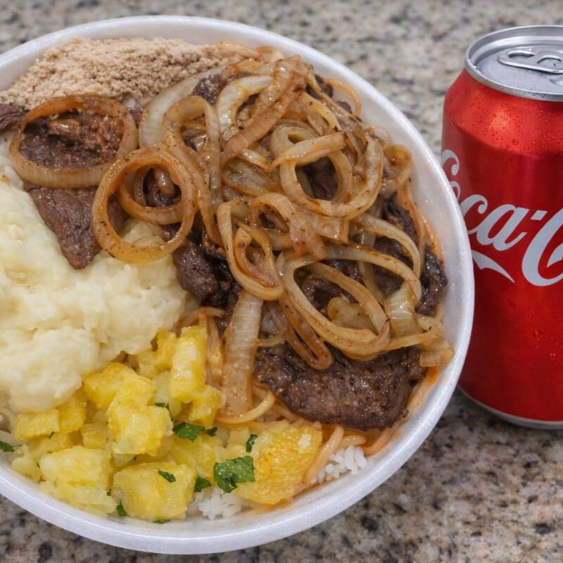 Deliciosa marmita de bife acebolado + coca lata, acompanhado de arroz,feijao, macarrão e farofa