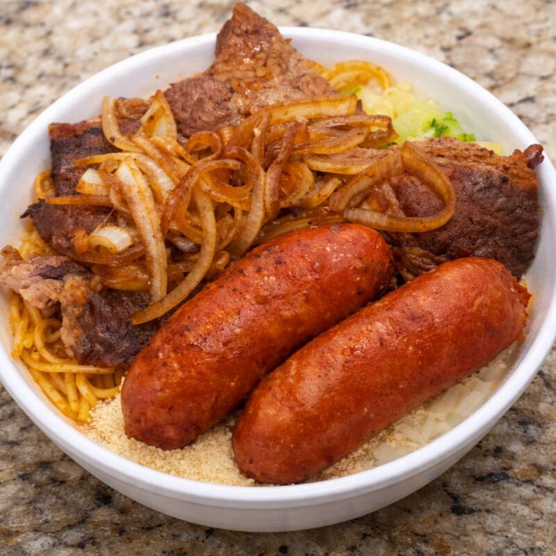 Deliciosa marmita de bife com linguiça, acompanha arroz,feijão,macarrão, farofa e legumes. Uma refeição completa para seu almoço ou jantar!