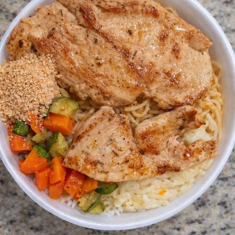 Marmita Grande: Peito de frango grelhado, arroz, feijão, macarrão, farofa. Uma deliciosa pedida para seu almoço ou jantar.